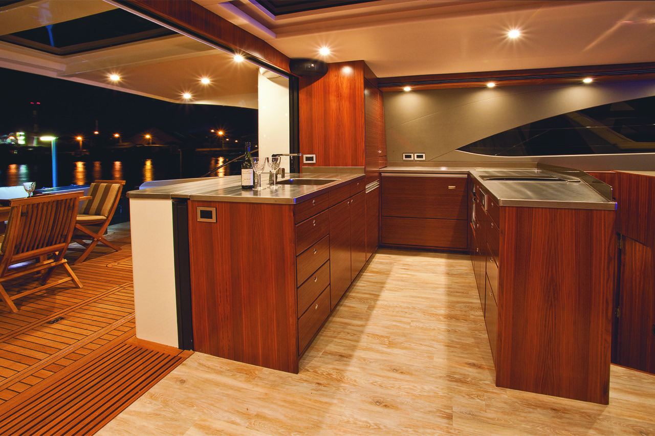 F5 is handsomely equipped for diving, fishing, relaxed cruising or all-out adventure. And with seamless indoor/outdoor flow F5 is an entertainer’s delight. The cockpit, galley, saloon and helm flow through to a large outdoor area. Altogether F5 can comfortably host up to 30 people on a day trip and sleeps up to six guests overnight.